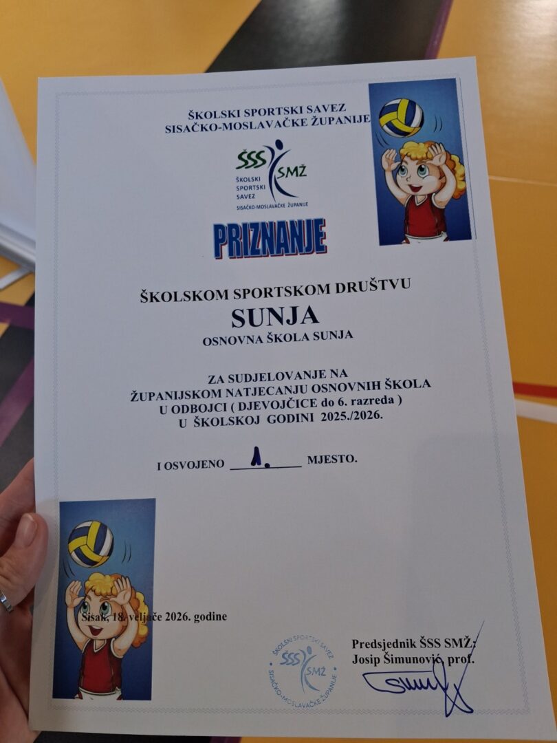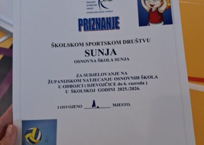 U muškoj konkurenciji od šest škola OŠ Sunja zauzela je 3. mjesto u ukupnom poretku, sa dva dobivena meča i jednim porazom. U ženskoj konkurenciji između pet škola Oš Sunja zauzima prvo mjesto i time smo izborili nastup na Županijskom natjecanju koje će se održati u Petrinji 30.1.2026.