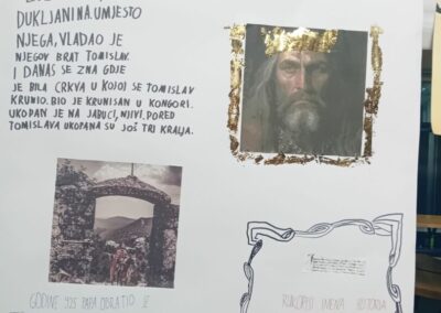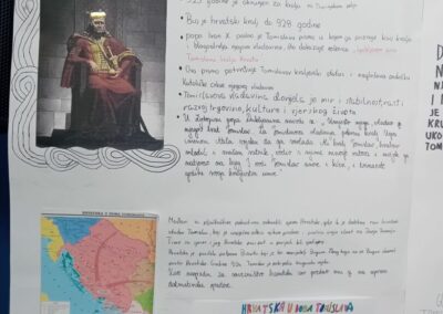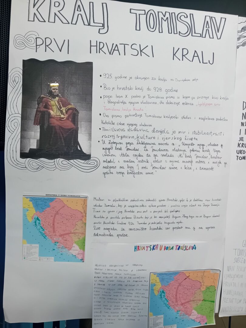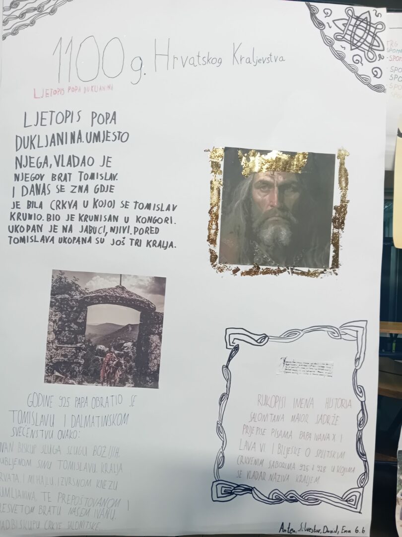 U našoj školi s ponosom smo obilježili 1100 godina Hrvatskog Kraljevstva kroz zanimljive i kreativne aktivnosti. Učenici 6.a i b razreda su izrađivali plakate, istraživali hrvatsku povijest, oblikovali krune te glumili kralja, podsjećajući nas na doba kralja Tomislava i početke hrvatske državnosti. Učimo koliko je važno njegovati ljubav prema svojoj domovini i njenoj povijesti. Sve smo zabilježili u nekoliko fotografija.
