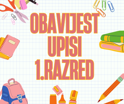 Dana 16. veljače 2026. godine u Nacionalnom informacijskom sustavu za upise u osnovne škole otvaraju se prijave za redovan upis u 1. razred osnovne škole. Roditelji će preko poveznice https://osnovne.e-upisi.hr/ moći podnijeti prijavu za upis svoga djeteta u 1. razred osnovne škole, sve do 15. ožujka 2026. godine.